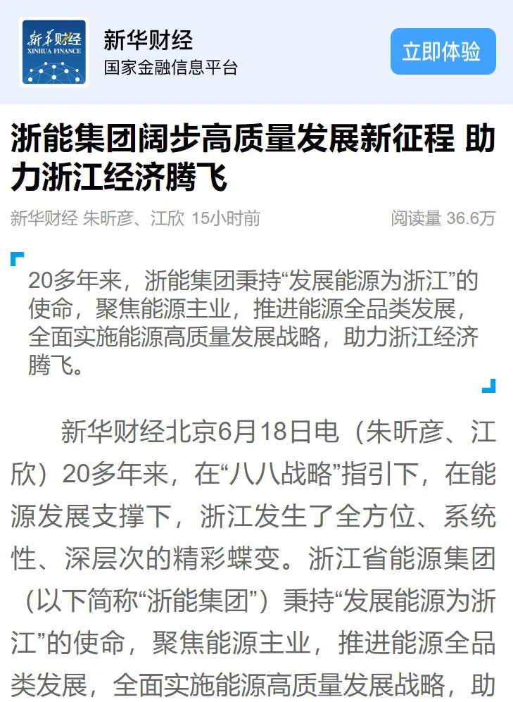 6月18日,中國金融信息網報道《發展能源為浙江 浙能集團闊步高質量發展新征程》。