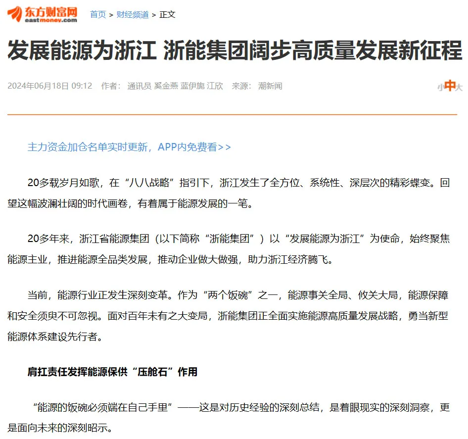 6月18日,東方財富網報道《發展能源為浙江 浙能集團闊步高質量發展新征程》。