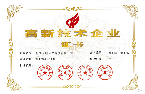 近日,浙江天地環??萍加邢薰精@得了由浙江省科學技術廳、浙江省財政廳、浙江省國家稅務局、浙江省地方稅務局聯合頒發的《高新技術企業證書。自2008年初次通過國家高新企業認定以來,天地公司已連續四次通過國家高新企業認定。國家高新技術企業評定是國家對具有自主知識產權的高科技企業的一項扶持政策,是我國科技創新類最高獎項之一。天地公司再次獲得認證標志著該公司在環境治理行業創新領域連續十年得到了國家相關部門的肯定。