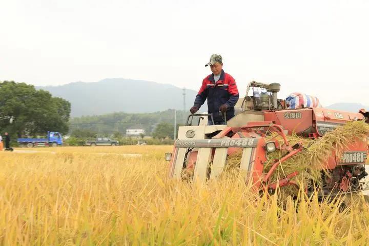 10月14日,浙能長廣集團(tuán)煤山區(qū)域5號(hào)復(fù)墾地塊,農(nóng)戶正駕駛收割機(jī)割稻。